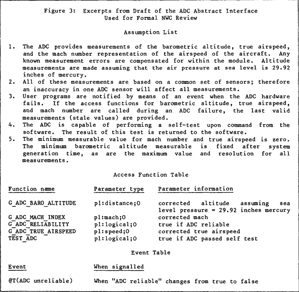 As an example of this procedure, this section sketches the development of the abstract interface to the Air Data Computer (ADC). The ADC is a sensor that measure barometric altitude, true airspeed, and the mach number representation of airspeed.